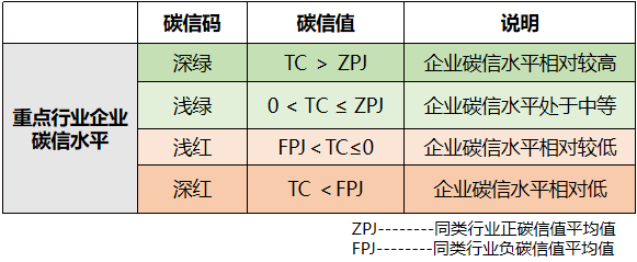 碳信码用来表征企业的碳信值在所处行业中的水平,以颜色区分,分为深绿色、浅绿色、浅红色和深红色。